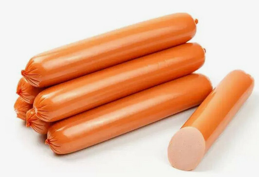 Состав: мясо куриное механической обвалки, вода питьевая, белковый стабилизатор (шкурка свиная, вода питьевая), филе грудки куриной, кожа куриная, жир свиной, субпродукты говяжьи, крахмал кукурузный, сыворотка молочная сухая, соль, смесь посолочно-нитритная (соль, фиксатор окраски: нитрит натрия), пряности и экстракты пряностей, белок животный (говяжий, свиной), стабилизаторы (пирофосфаты, полифосфаты, альгинат натрия), регуляторы кислотности (трифосфаты, цитраты натрия, ацетат натрия, лактат кальция, карбонат натрия), загустители (камеди: гуаровая, ксантановая, рожкового дерева, конжаковая; каррагинан из водорослей EUCHEUMA), антиокислители (аскорбат натрия, аскорбиновая кислота, лимонная кислота),усилитель вкуса и аромата: глутамат натрия 1-замещенный, ароматизатор, сахар, краситель: кармины.