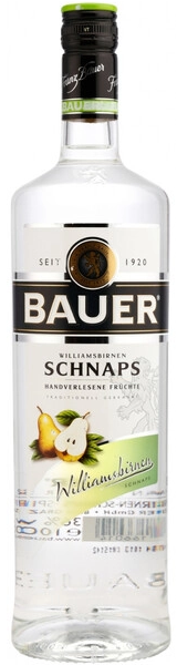 "Bauer" Williamsbirnen — популярный, традиционный австрийский шнапс, созданный из спелых плодов груши Вильямс методом двойной дистилляции. Шнапс обладает насыщенным ароматом и сочным, хорошо сбалансированным фруктовым вкусом с приятным, согревающим послевкусием. Шнапс Груша Вильямс от компании "Бауэр" рекомендовано употреблять в качестве дижестива, а также в составе коктейлей.