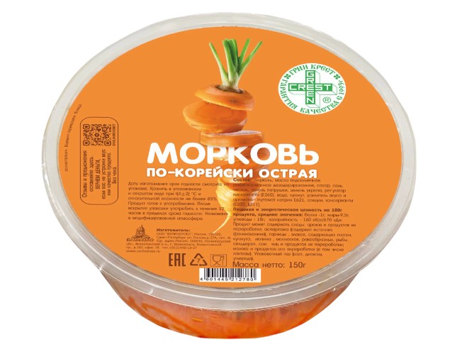 Состав: капуста белокочанная, морковь, сахар, масло подсолнечное рафинированное дезодорированное, соль, чеснок, регулятор кислотности Е260, вода, кунжут, зелень петрушки, зелень укропа, усилитель вкуса и аромата Е621, специи, консерванты (E202, E211). Упаковочный газ (азот, диоксид углерода).