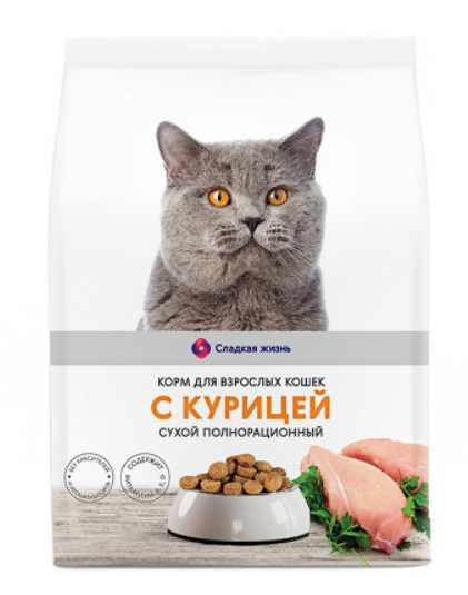 Состав: зерновые культуры и продукты их переработки, продукты животного происхождения (куриная мука, мясная мука, экстракт гидролизованной печени), кукурузный глютен, животные жиры и масла, пульпа сахарной свеклы, дрожжи сухие, минеральные вещества и витамины, таурин, консервант (микокарб).