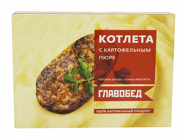 Состав: котлета (говядина, курица, лук репчатый, хлеб пшеничный 1 сорт, молоко натуральное, сухарь хлебный панировочный из муки высшего, 1,2 сортов, масло подсолнечное, соль, бульон сухой «говядина», перец черный), пюре картофельное (картофель, вода питьевая, молоко натуральное, масло сливочное, соль), соус (вода, томатная паста, морковь свежая, лук репчатый, соль, мука пшеничная, бульон сухой «говядина», петрушка сушеная, укроп сушеный).